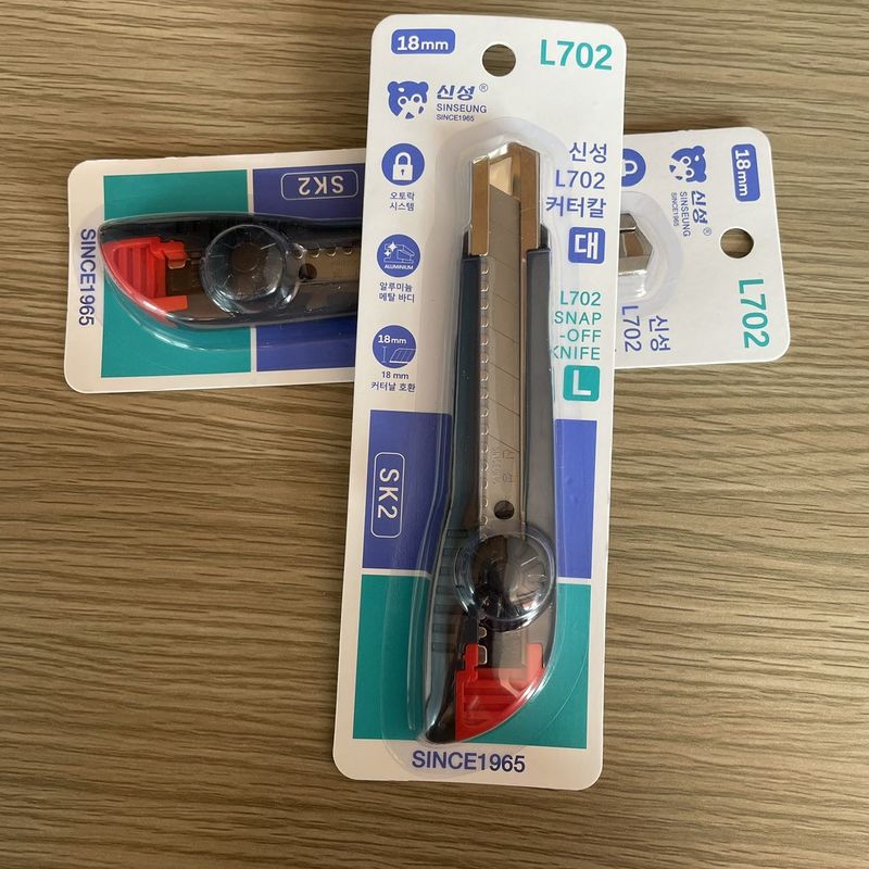 SINSEUNG L702 18mm 유틸리티 나이프 제작에 사용되는 재료는 ABS + 합금 + SK2 블레이드입니다.용기장이나 도구장치에 쉽게 보관할 수 있습니다..